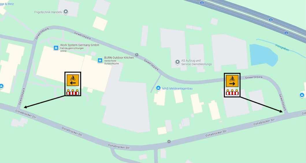 Als Ausweichstrecke ist für diesen Zeitraum der Weg durch den Gewerbepark vorgesehen und entsprechend ausgeschildert.