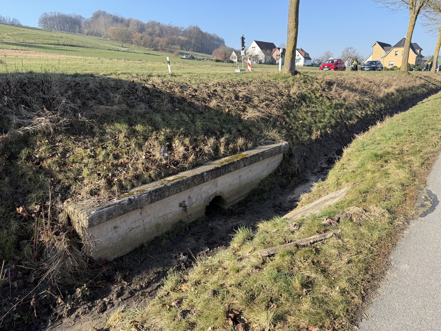 Am Entwässerungsgraben an der Osnabrücker Straße sind aktuell auf Höhe des Gewerbeparks Arbeiten nötig. Einerseits wird ein Übergang zum kombinierten Fuß- und Radweg erstellt, andererseits soll ein maroder Ablauf erneuert werden.