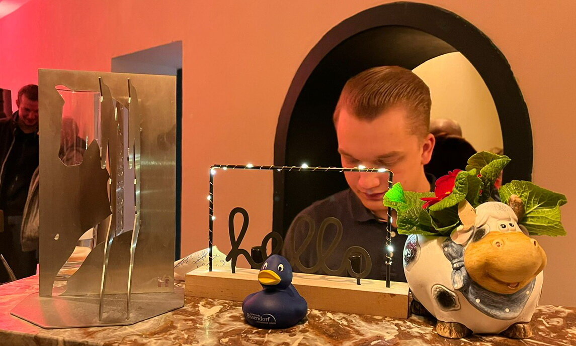 Auf der Theke der "Sünse Pinte" thronte am Eröffnungsabend allerlei Getier: Zur Pferdeskulptur und zur umtriebigen Quietscheente der Gemeinde Bissendorf gesellte sich eine Keramik-Pflanzschale in Kuh-Optik.