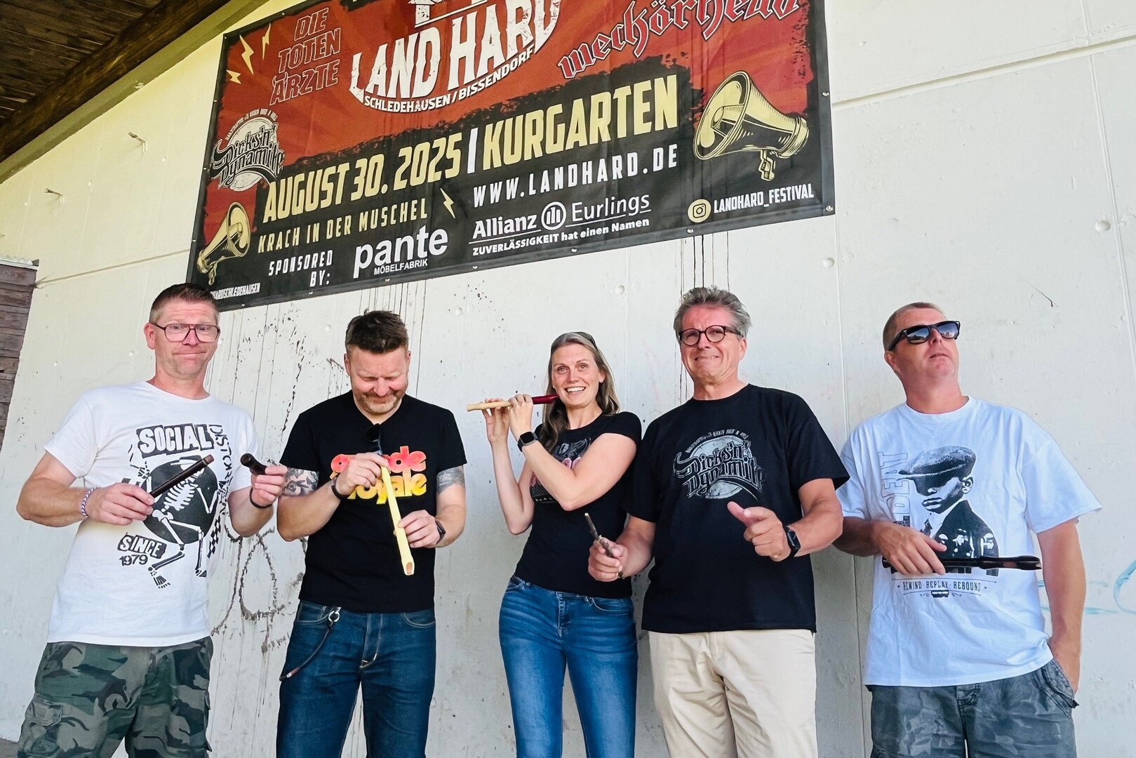 „Blockflötenklänge wird es am 30. August sicherlich nicht geben!“, betonen die Macher des "LandHard" Festivals unisono, als sie mit Bürgermeister Guido Halfter für ein entsprechendes Foto posieren.