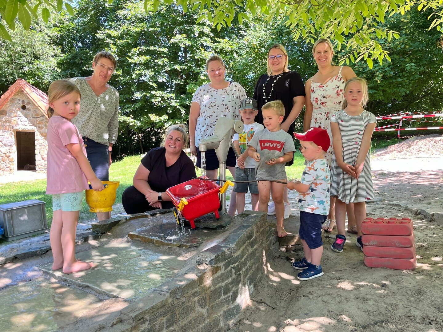 Erstellt wurde die neue Matschanlage mit massiver Natursteineinfassung von einem Gartenbauunternehmen aus Bissendorf. Die Wasserpumpe befindet sich unter einem schattenspendenden Baum an zentraler Stelle des weitläufigen Außengeländes.