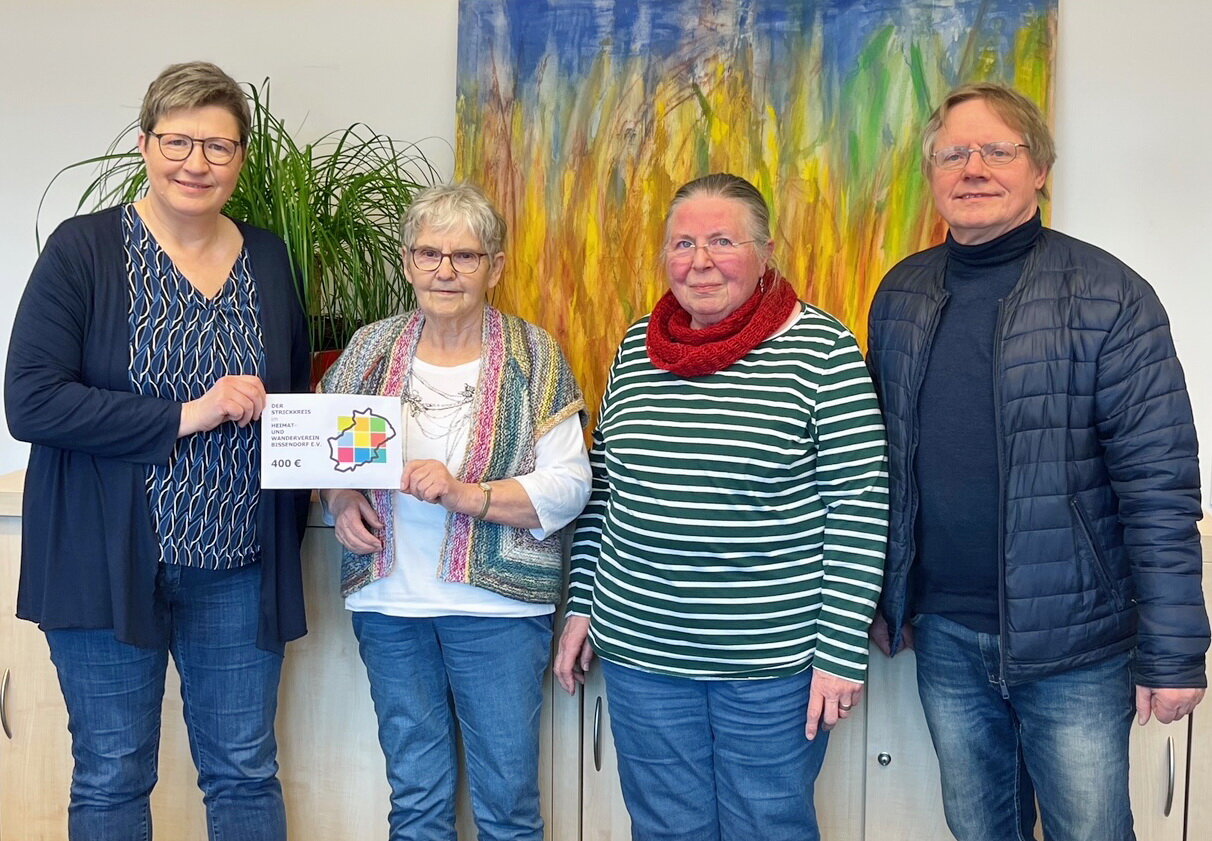 Fachdienstleiterin Martina Storck, Ingrid Goertz, Irmtraud Tylle und Uwe Bullerdiek bei der Spendenübergabe des Strickkreises für das Bissendorfer Schulpaket.