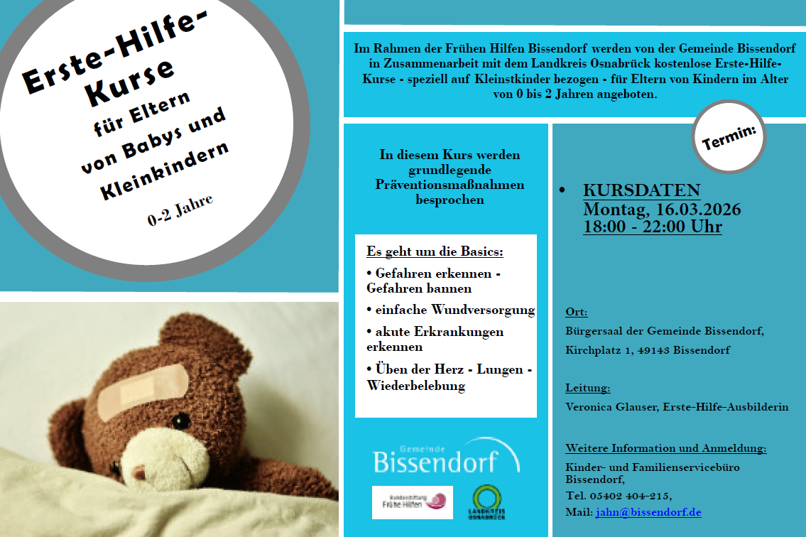 Im Rahmen der Frühen Hilfen werden auch in 2026 kostenlose Erste-Hilfe-Kurse - speziell auf Kindernotfälle bezogen - angeboten.