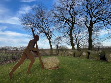 Nun werden Sie sich fragen: „Wie alt sind diese Hünengräber bei uns?“ In Stadt und Landkreis tauchen sie oft völlig unvermittelt auf und überraschen jeden, der sie zum ersten Mal sieht – die Großsteingräber. Fachleute bezeichnen sie als Megalithgräber, von griechisch mega = groß und lithos = Stein. Auf den ersten Blick sieht man eine Ansammlung riesiger Findlinge, die paarweise angeordnet sind. Sie werden zum Teil von großen Steinplatten abgedeckt. Weil sich früher niemand vorstellen konnte, dass normale Menschen diese großen Steine bewegt haben könnten, erfand man die Geschichte von riesenhaften Wesen. Diese Hünen sollen die Anlagen errichtet haben. Archäologen können heute nachweisen, dass diese Gräber aus der Jungsteinzeit stammen. Sie sind zwischen 5.000 und 5.500 Jahre alt. Damit zählen die „Hünengräber“ zu den ältesten Kulturdenkmalen in Europa. Sie sind älter als die ägyptischen Pyramiden.