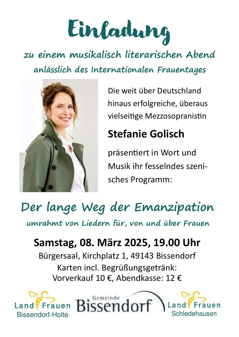 In ihrem Programm "Der lange Weg der Emanzipation" beleuchtet die Mezzo-Sopranistin Stefanie Golisch durch Musik und Text die Rolle der Frau in der Gesellschaft. Dabei erklingen unter anderem Stücke wie Clara Schuchmann´s "Vorwärts", "Brot und Rosen" oder "Ciao Bella ciao".