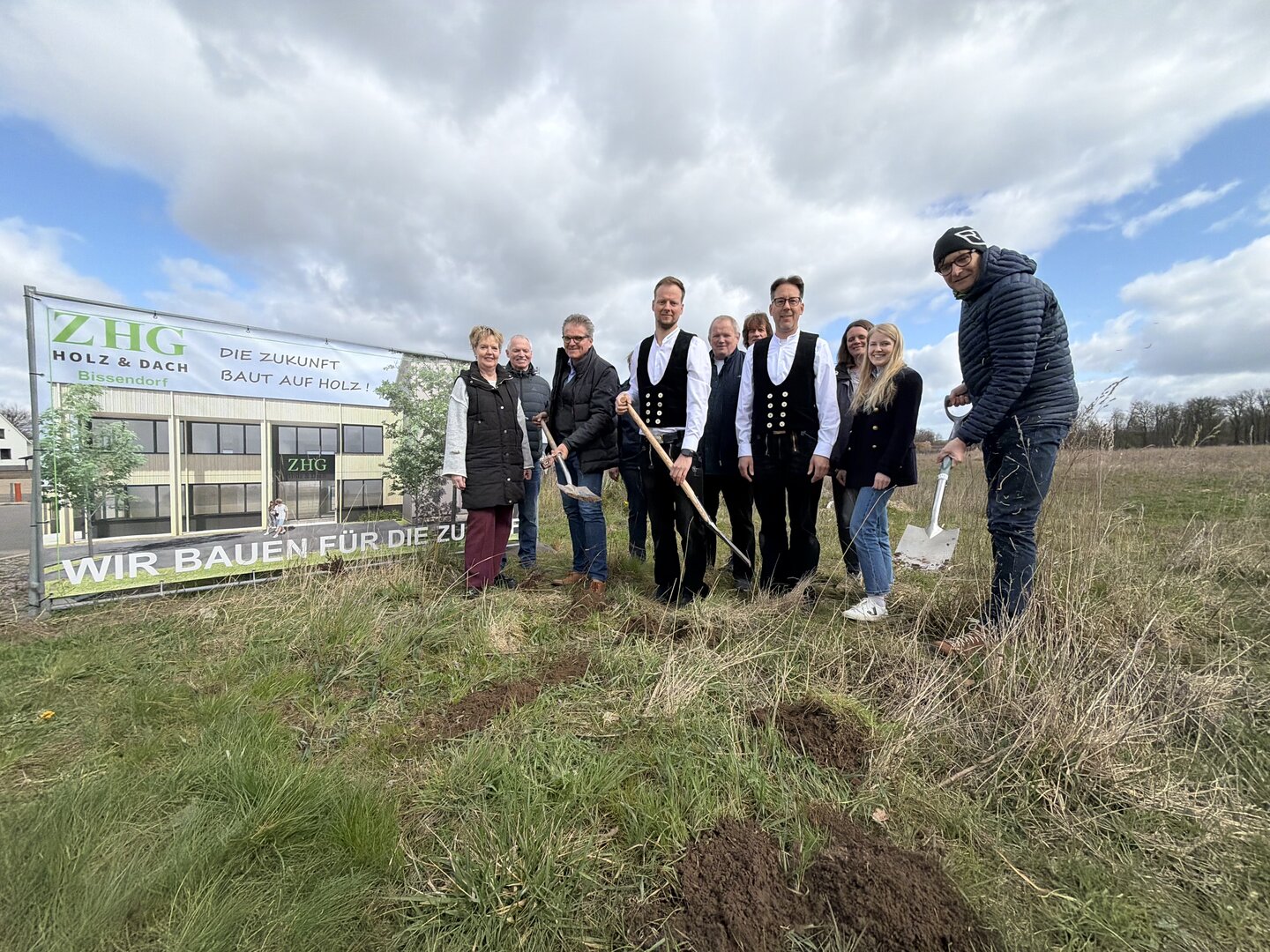 Mit einem symbolischen ersten Spatenstich hat die ZHG Holz & Dach GmbH mit dem Bau ihres neuen Unternehmensstandorts an der Natberger Straße begonnen. Der Bissendorfer Spezialist für Holzrahmenbau und Dächer ist damit das zweite Unternehmen, das in dem neuen Gewerbegebiet „Natberger Feld“ baut.