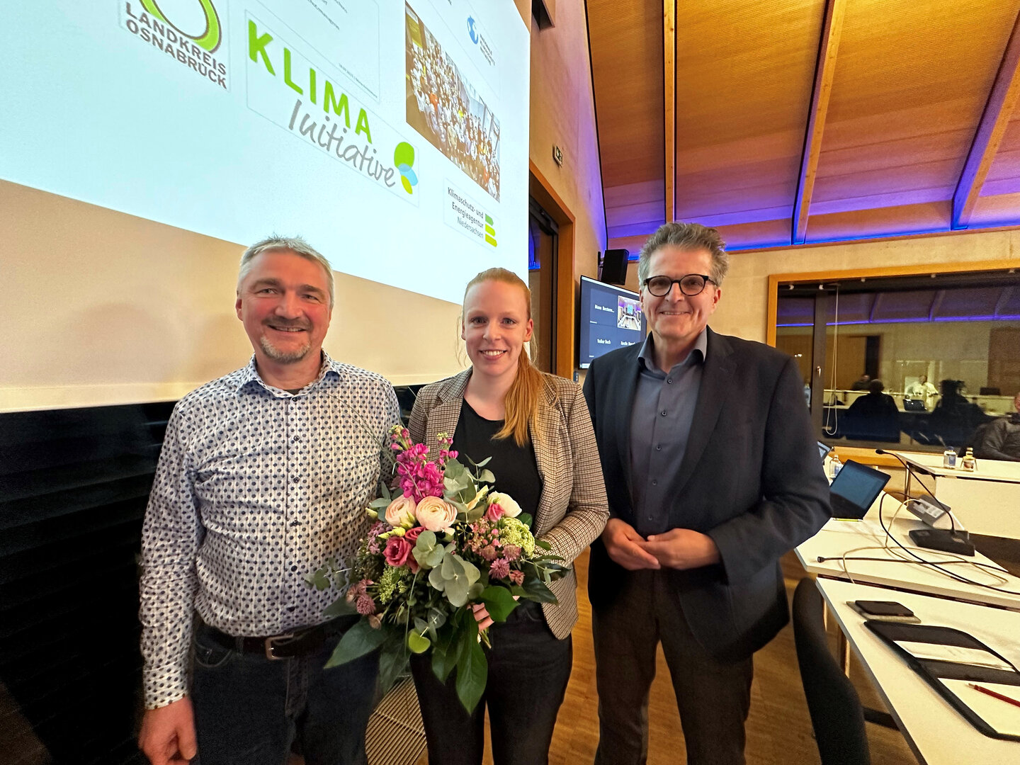 Bürgermeister Guido Halfter und der Vorsitzende des Werks- Klimaschutz- und Umweltausschuss Michael Heckmann dankten der scheidenden Klimaschutzmanagerin Mona Berstermann für ihre Arbeit in Bissendorf.©Gemeinde Bissendorf