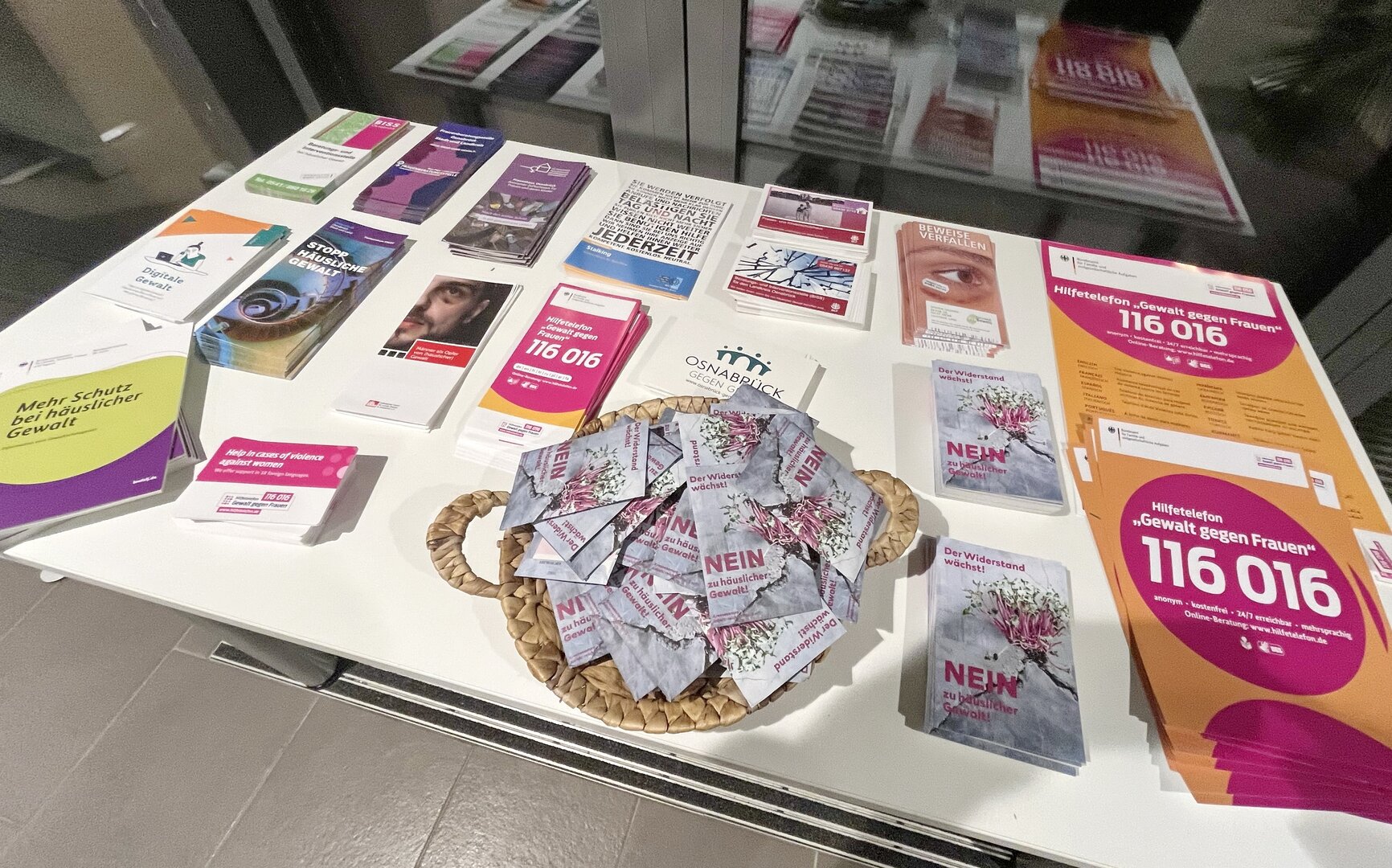 Im Foyer des Bissendorfer Rathauses liegen aktuell vielfältige Informationen zum Thema Beratung, Intervention und mehr Schutz bei häuslicher Gewalt aus. Fotos: Gemeinde Bissendorf / Kollorz