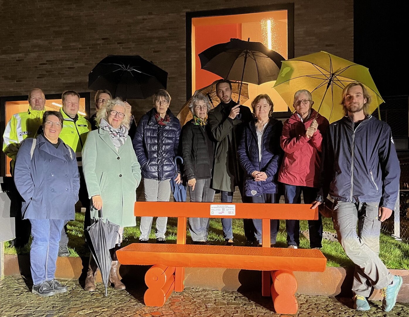 „Hier ist kein Platz für Gewalt an Frauen und Mädchen“ ist auf der Lehne der frisch aufgestellten Sitzgelegenheit zu lesen. Darunter: ein Kontakt zur Beratungsstelle bei häuslicher Gewalt (BISS), ein QR-Code, der weitere Hilfsangebote für Betroffene bündelt, aber auch ein Kontakt zur Täterarbeit im Fachzentrum Faust. Gefertigt wurde die Bank von Mitarbeitern der Heilpädagogischen Hilfe Osnabrück (HHO). Im auffälligen Farbton gestrichen von Mitgliedern des Arbeitskreises der Gemeinde Bissendorf.