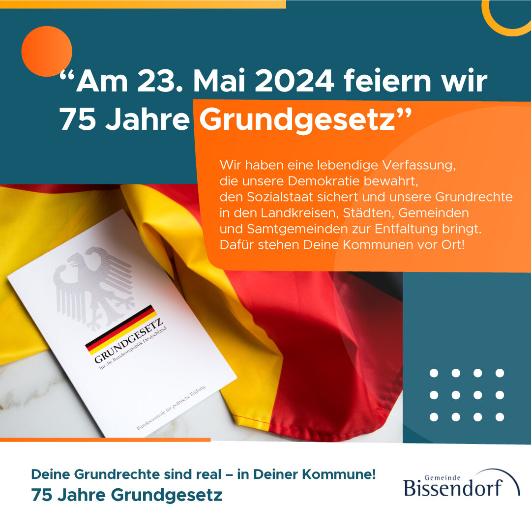 Mit einer Social-Media-Kampagne zum 75. Geburtstag des Grundgesetzes richtet sich der Niedersächsische Städte- und Gemeindebund (NSGB) zurzeit an seine Mitgliedskommunen. Die Gemeinde Bissendorf möchte die Kampagne aus Hannover aktiv über ihre Öffentlichkeitsarbeit unterstützen.