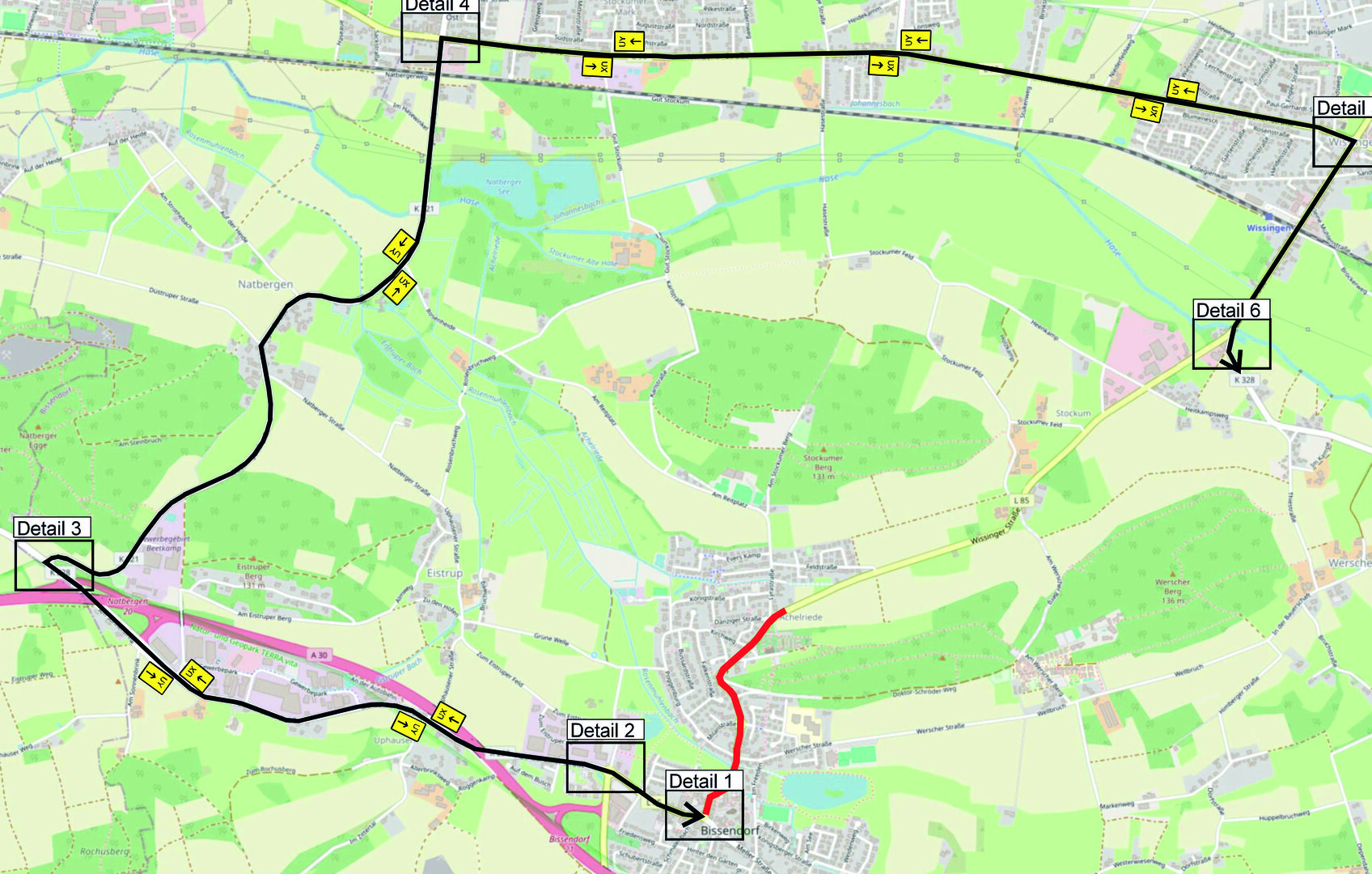Mit dieser Verschiebung ändert sich auch die Zufahrt zu den Geschäften an der Osnabrücker Straße und zum Rathaus. Der Ortskern Bissendorf ist jetzt nur über die Osnabrücker Straße zu erreichen. Eine Umleitung zwischen Bissendorf und Wissingen ist über die Mindener Straße, die Lüstringer Straße und die Osnabrücker Straße in beiden Richtungen ausgeschildert. Die Nutzung von „Schleichwegen“ in Bissendorf ist weiterhin nicht gestattet.