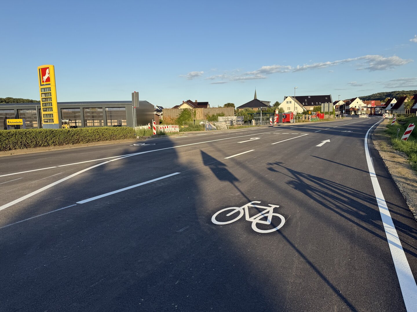 Am 3. September 2025 wandert die Baustelle an der L85 in der Ortsdurchfahrt in Bissendorf. Der erste Bauabschnitt an der Osnabrücker Straße zwischen dem Kreisel am Ortseingang und dem Minikreisel ist abgeschlossen, die Fahrbahn ist erneuert und die Markierungen sind aufgetragen. Dazu gehört auch die neue Linksabbiegerspur, die zum neuen Feuerwehrhaus der Gemeindefeuerwehr Bissendorf führen wird. Ebenfalls aufgemalt sind die Fahrradsymbole, die noch einmal auf die zweirädrigen Verkehrsteilnehmer aufmerksam machen sollen.