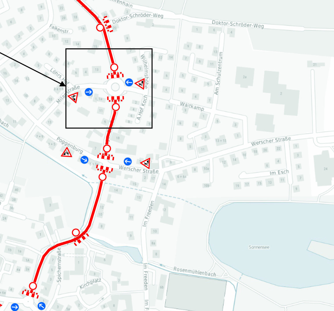 Der Kreisel im Bereich der Milanstraße/Wilhelmshöhe bleibt für die Querung von West nach Ost sowie in die Gegenrichtung frei. Während der Bauarbeiten im Bereich des Kreisels in der Zeit vom 15.09.2025 - 25.09.2025 wird dieser einseitig von Ost nach West und in die Gegenrichtung befahrbar bleiben. (s. Abbildung rechts)