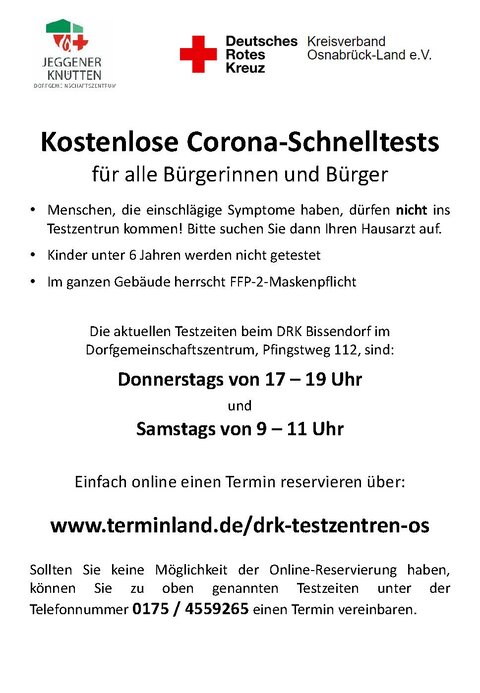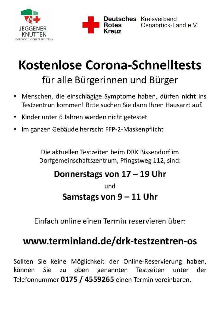 Beim DRK-Ortsverein Bissendorf am Pfingstweg 112 in Jeggen werden aktuell Corona-Schnellstests an folgenden Tagen durchgeführt: