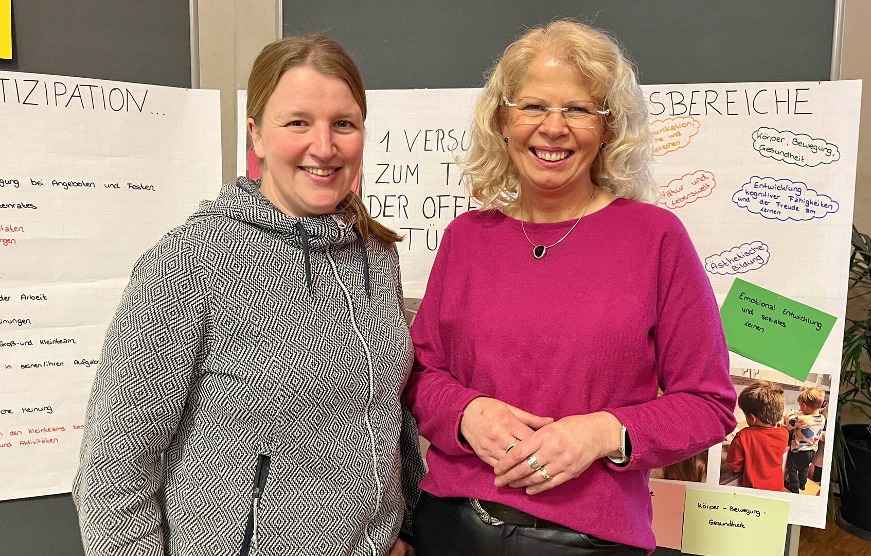 Begrüßt wurden Erzieherinnen und Elternvertreter durch Dipl.-Päd. Bärbel Kruthaup von der Bildungsagentur Dammer Berge. Gemeinsam mit Inga Doll, Diplom-Sozialarbeiterin/Sozialpädagogin vom nifbe (Niedersächsisches Institut für frühkindliche Bildung und Entwicklung) führte die Supervisorin und Institutsberaterin durch den Nachmittag.