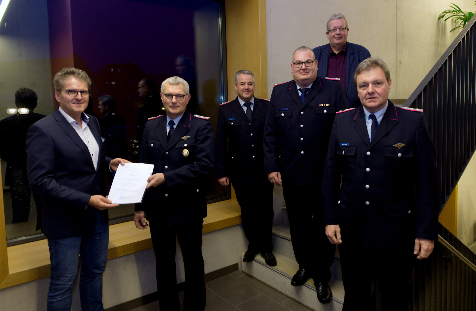 v.l.: Bürgermeister Guido Halfter überreicht Jörg Sommer die Ernennungsurkunde. Oliver Eckl (Ortsbrandmeister), Torben Preuss (Gemeindebrandmeister), Bernd Stegmann (Fachdienstleiter) und Stefan Hoge (stellv. Gemeindebrandmeister) gratulieren.