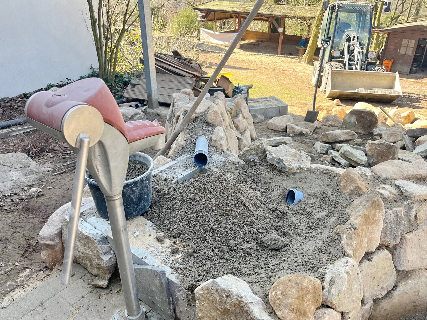 Sobald alles fertiggestellt ist, können die Kindergartenkinder am neu gestalteten Wasserlauf unterschiedlichste Bereiche erleben: Neben einem oben gelegenen Wasserbecken mit Staumöglichkeiten durch verschließbare Rohre, sucht das Wasser über Steintreppen frei sichtbar seinen Weg. Im unteren Bereich der Anlage entsteht ein großes Auffangbecken, das nach Lust und Laune zum Matschen einlädt. Eine in der Mitte befindliche, vormals verschenkte Fläche, wird zum Sandkasten umfunktioniert.