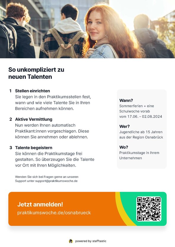 Bei diesem für die Unternehmen im Landkreis Osnabrück kostenfreien Angebot müssen sich diese lediglich auf der Online-Plattform der Praktikumswoche anmelden und angeben, an welchen Tagen im Aktionszeitraum vom 17. Juni bis zum 2. August 2024 sie ein Tagespraktikum anbieten möchten. Auf Basis der gemachten Angaben matched das System automatisch Schülerinnen und Schüler mit den Unternehmen. Durch die Einbindung von Multiplikatoren an den regionalen Schulen wird die Praktikumswoche bei den Schülerinnen und Schülern bekannt gemacht.