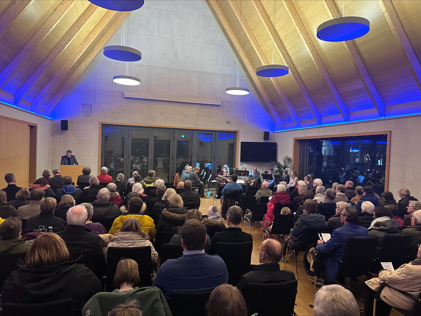 Stimmungsvoller Höhepunkt des Abends war eine Kerzenaktion, bei der die Flamme vom Rednerpult aus Stück für Stück durch die Reihen weitergeleitet wurde und den dafür abgedunkelten Bürgersaal in ein warmes, hoffnungsvolles Licht tauchte. So konnten die Besucherinnen und Besucher in eine schöne Silvesternacht und ein hoffentlich frohes, gesundes und friedliches Jahr 2025 starten.