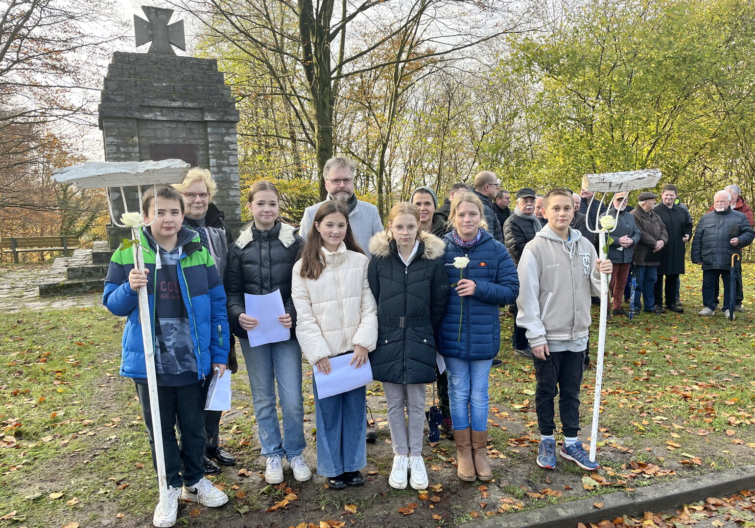 Besonders begrüßenswert: Mit einer Delegation der Oberschule am Sonnensee leisteten an der zentralen Gedenkfeier am Volkstrauertag dieses Jahr erstmals auch Jugendliche aus der Gemeinde Bissendorf einen aktiven Beitrag zur Erinnerungskultur. Als Vertreter des Netzwerks „Schule ohne Rassismus – Schule mit Courage“, für die der Osnabrücker Künstler Volker-Johannes Trieb eine Patenschaft übernommen hat, waren die Mädchen und Jungen gemeinsam mit Rektor Markus Gerling, Konrektorin Anke Schröder und der Didaktischen Leiterin, Holle Brandolini, nach Holte gekommen.