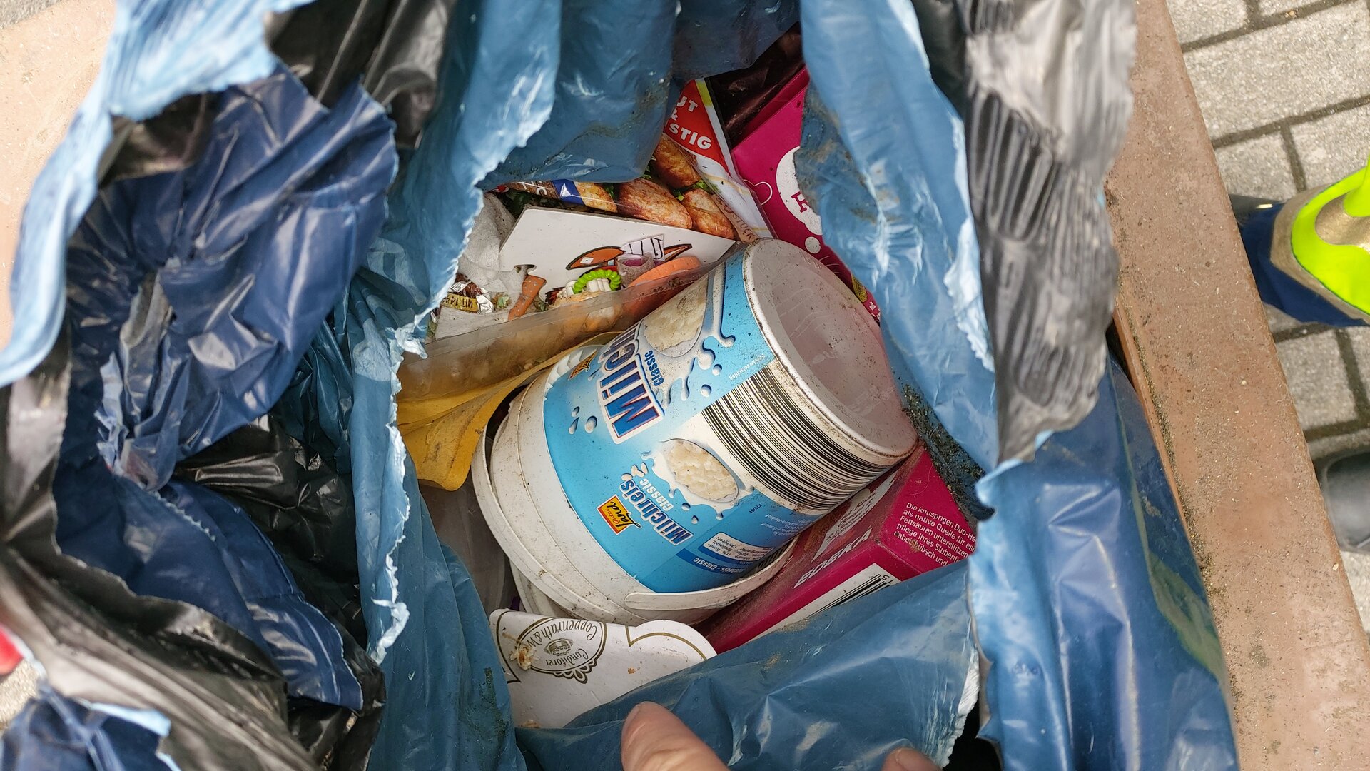 Beispiel für die „rote Karte“: Diese klar fehlbefüllte Tonne wird durch die Kontrolleure mit einem roten Tonnenanhänger gekennzeichnet. Die Müllabfuhr lässt den Behälter dann stehen.