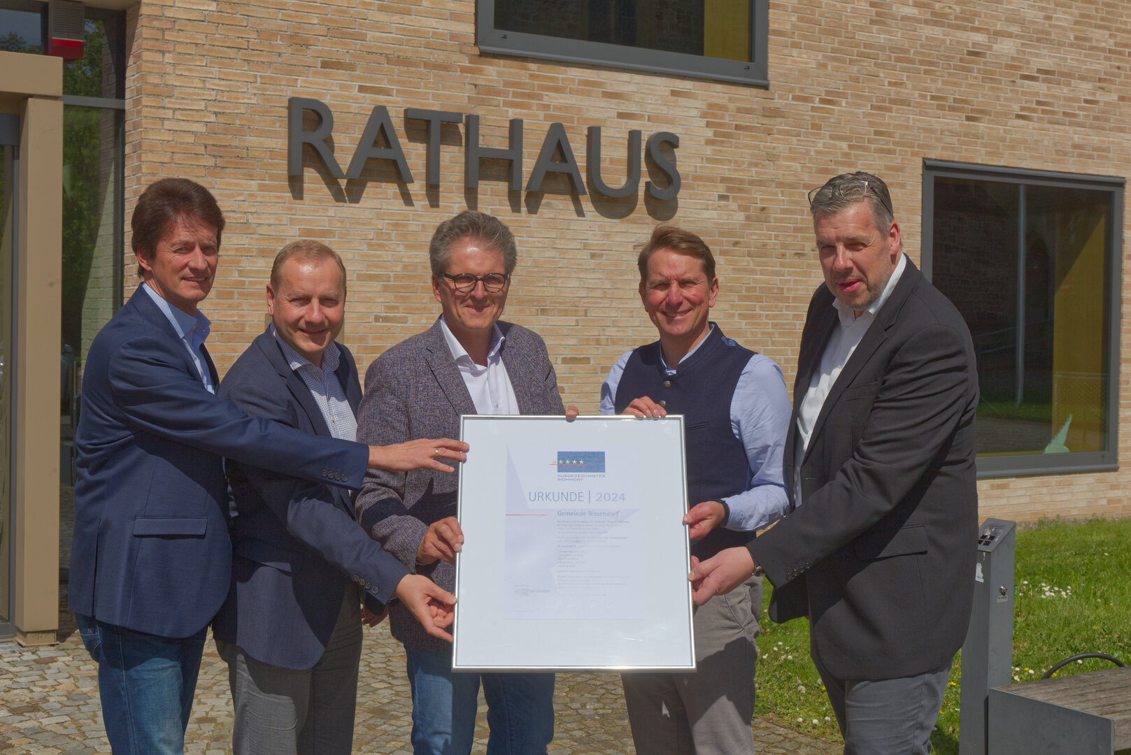Ingo Nagel (Fachdienstleiter Planen und Bauen), Roland Arndt (VGH Versicherungen Roland Arndt), Bürgermeister Guido Halfter, IHK-Hauptgeschäftsführer Marco Graf und Thorsten Treidel (CT Cloud Design) freuen sich über die erfolgreiche neue Zertifizierung der Gemeinde.©Gemeinde Bissendorf