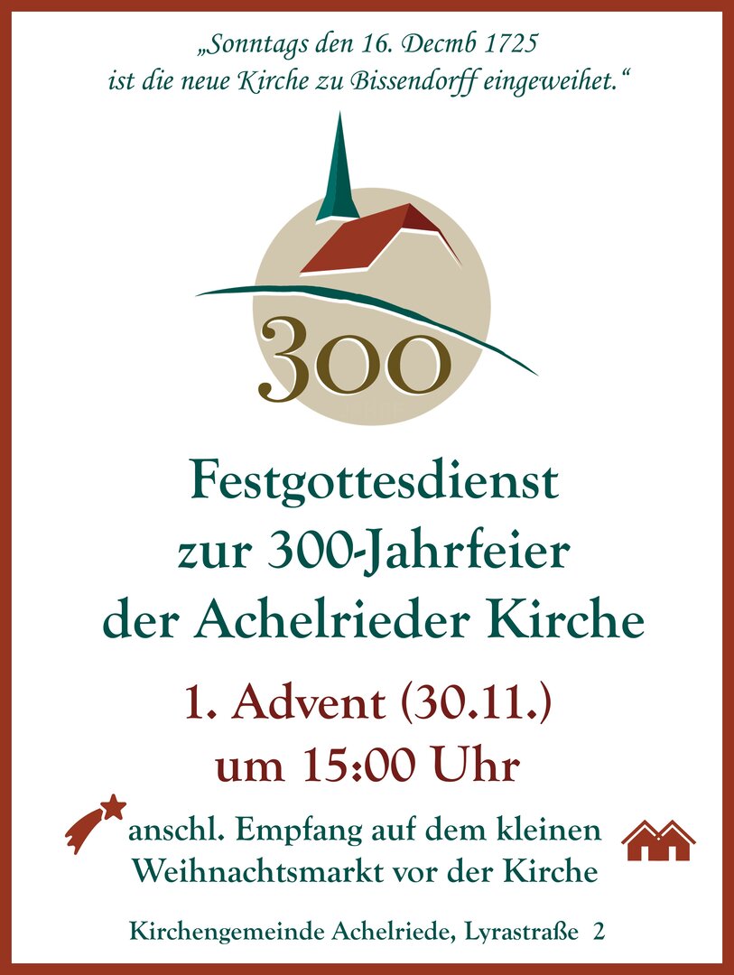 Festgottesdienst zur 300-Jahrfeier der Achelrieder Kirche, anschließend Empfang auf dem kleinen Weihnachtsmarkt vor der Kirche