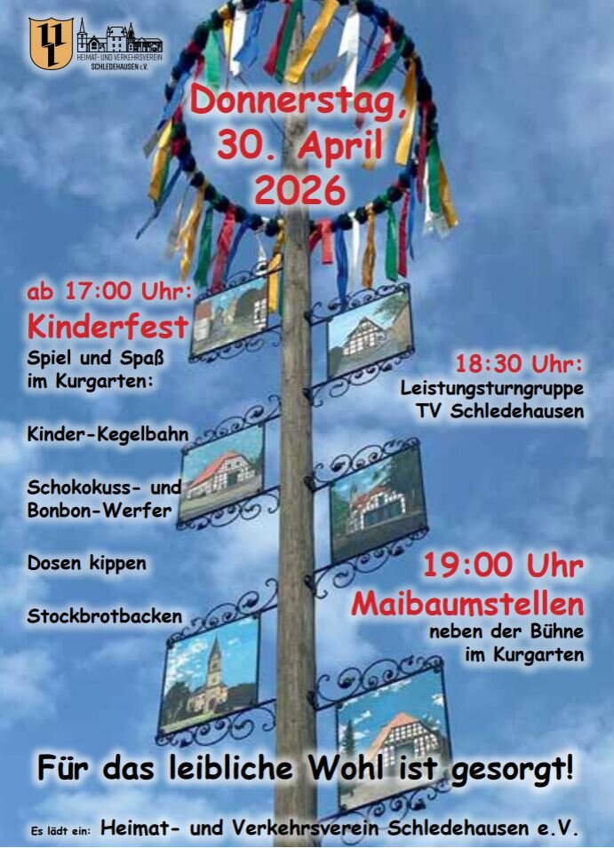 Um 17 Uhr beginnen Spiel und Spaß im Kurgarten mit Kinder-Kegelbahn, Schokokuss- und Bonbon-Werfer, Dosen kippen und Stockbrotbacken. Gegen 18.30 Uhr präsentiert die Leistungsturngruppe des TV Schledehausen ihr Können. Ab 19 Uhr wird der Maibaum neben der Bühne im Kurgarten eingeweiht..