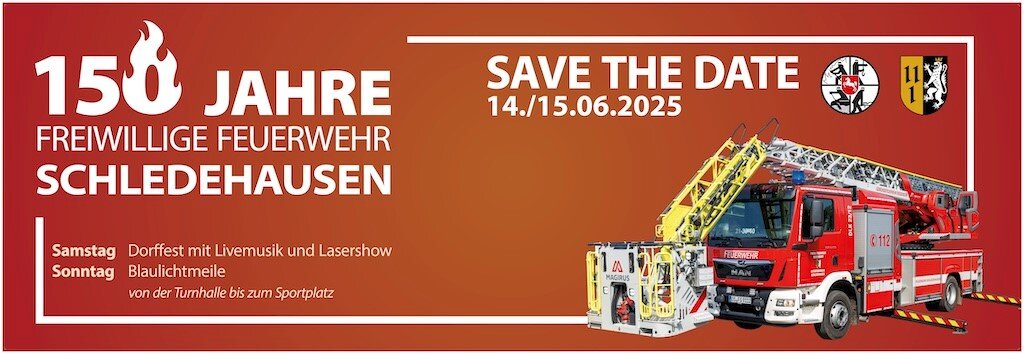 Die Ortsfeuerwehr Schledehausen wird 150 Jahre alt. Samstag: Dorffest mit Livemusik, DJ und Lasershow. Sonntag: Blaulichtmeile von der Turnhalle bis zum Sportplatz, Jubiläumskonzert des Feuerwehrmusikzugs u.v.m.