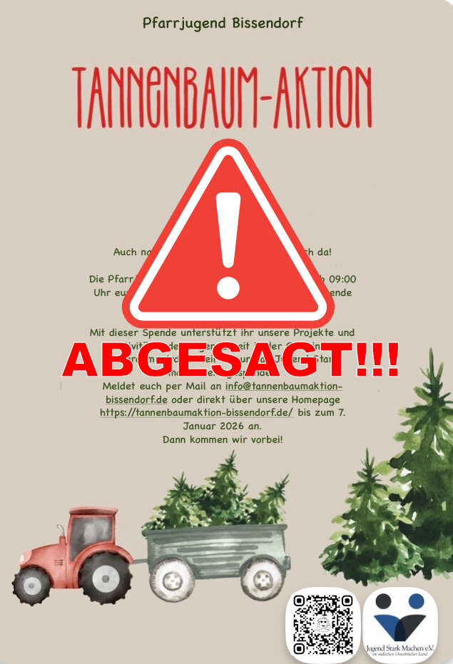 am 10. Januar 2026 ist es wieder soweit: Die Tannenbaumaktion startet! Die Pfarrjugend Bissendorf tritt in große Fußstapfen und führt die traditionsreiche Sammlung der KAB Bissendorf fort und holt Ihre ausgedienten Bäume direkt bei Ihnen ab.