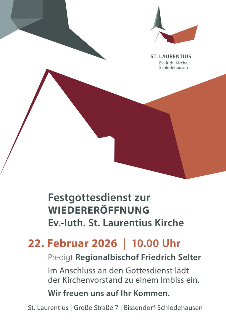 Der Kirchenvorstand lädt Sie herzlich ein zum Festgottesdienst anlässlich der Wiedereröffnung der ev.-luth. St. Laurentiuskirche Schledehausen. Anschließend gibt es einen Imbiss.