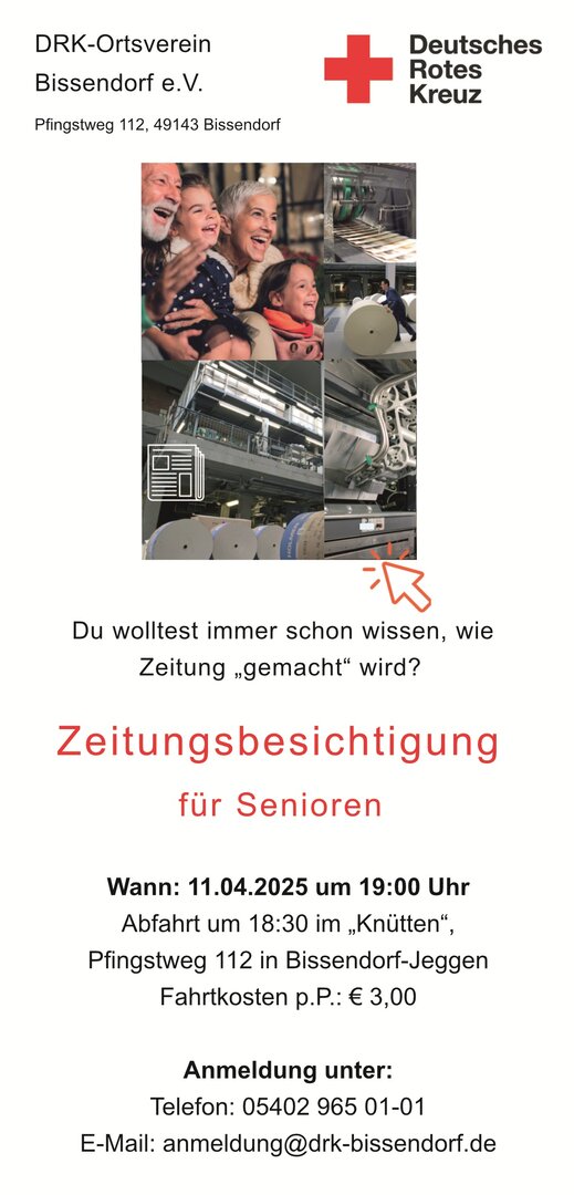 Das DRK Bissendorf lädt interessierte Seniorinnen und Senioren zur Besichtigung des Druckzentrum Osnabrück am 11. April 2025.