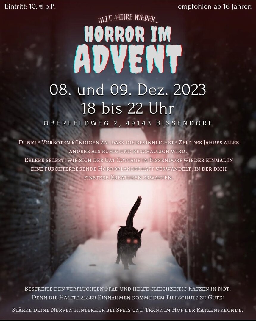 Unter dem Namen "Horror im Advent" zeigen wir dass die besinnlichste Zeit des Jahres auch mal ganz anders sein kann als ruhig und beschaulich. Der Cat Cottage in Bissendorf verwandelt sich dann in eine vorweihnachtliche Horrorlandschaft. Neben Weihnachtsdeko gibt es viel schauriges zu sehen, in Form eines großen Gruselgangs, den die Besucher durchqueren und auf verkleidete Erschrecker treffen.
