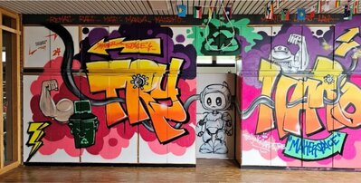 Diese Graffitwand mit farbenfrohem Schriftzug gestalteten Schülerinnen und Schüler der OBS-GY.