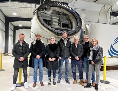 Stefan Holtgreife und Klaus Roloff (Solarlux GmbH), Anna Büning, Fabian Flohre und Holger Hämel (Deutsche Windtechnik GmbH) sowie Guido Halfter und Angelika Trinkaus (Gemeinde Bissendorf) machten sich in der neuen Halle hinter dem InnovationsForum Bissendorf ein Bild von der künftigen Nutzung. Im Hintergrund: das gigantische Gehäuse eines per Schwertransport dort hin verfrachteten Windrads zu Trainingszwecken. Foto: Gemeinde Bissendorf Johanna Kollorz©Gemeinde Bissendorf Kollorz
