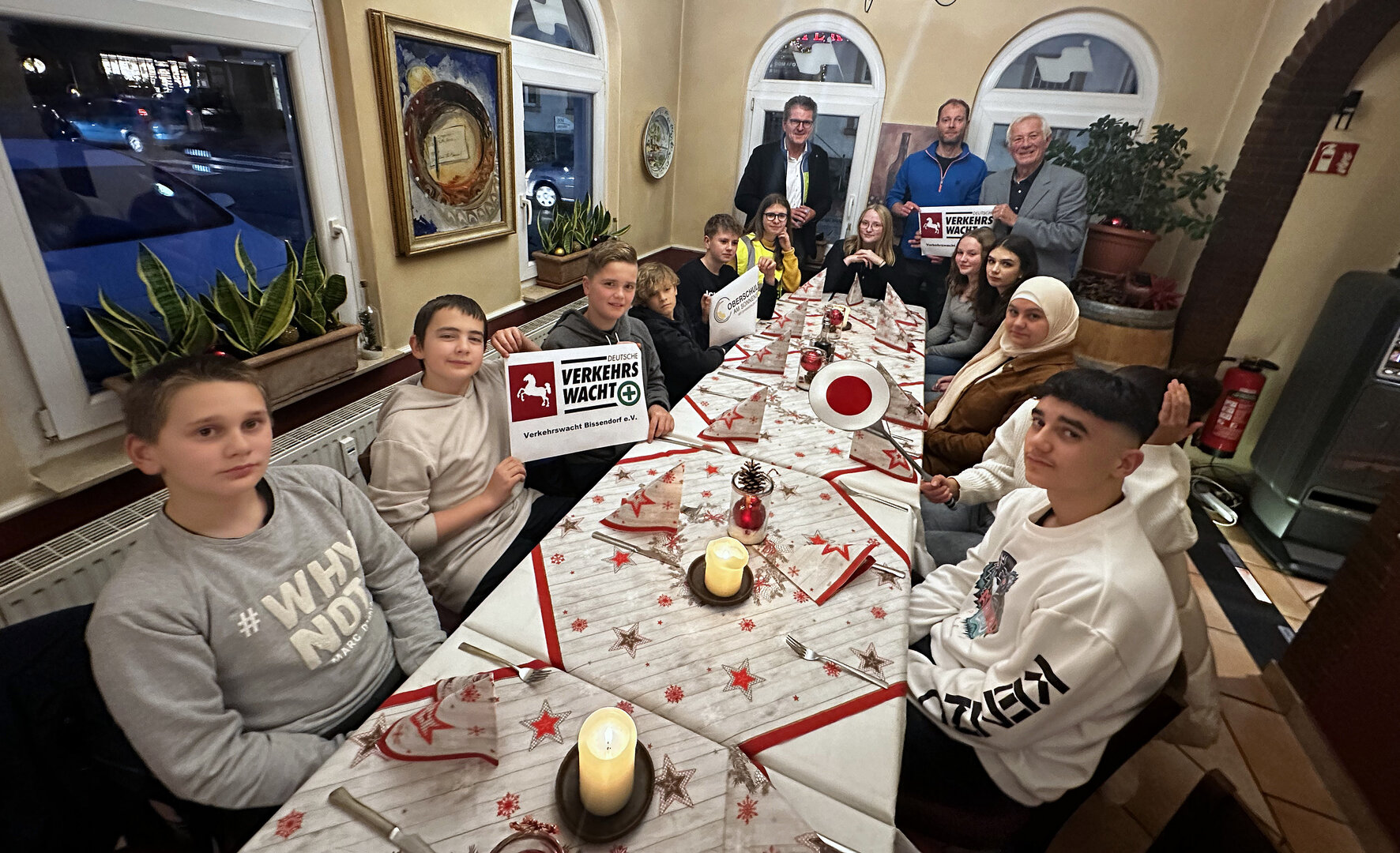 Mit Warnweste und Kelle „bewaffnet“ sind sie bei Wind und Wetter, Sonne und Regen unterwegs und sorgen für einen sicheren Schulweg: Die Schülerlotsinnen und Schülerlotsen der Oberschule am Sonnensee mit gymnasialem Angebot. Kurz vor Weihnachten ehren die Gemeinde Bissendorf und die Verkehrswacht Bissendorf sie traditionell mit einem Essen in der Pizzeria „La Rustica“ und einem Präsent. „Es ist ganz toll, dass ihr das jeden Morgen macht“, lobte Bürgermeister Guido Halfter die Jugendlichen beim diesjährigen Pizzaessen. „Bei Wind und Wetter steht ihr vor allen anderen auf und sichert den Grundschulkindern den Schulweg.“